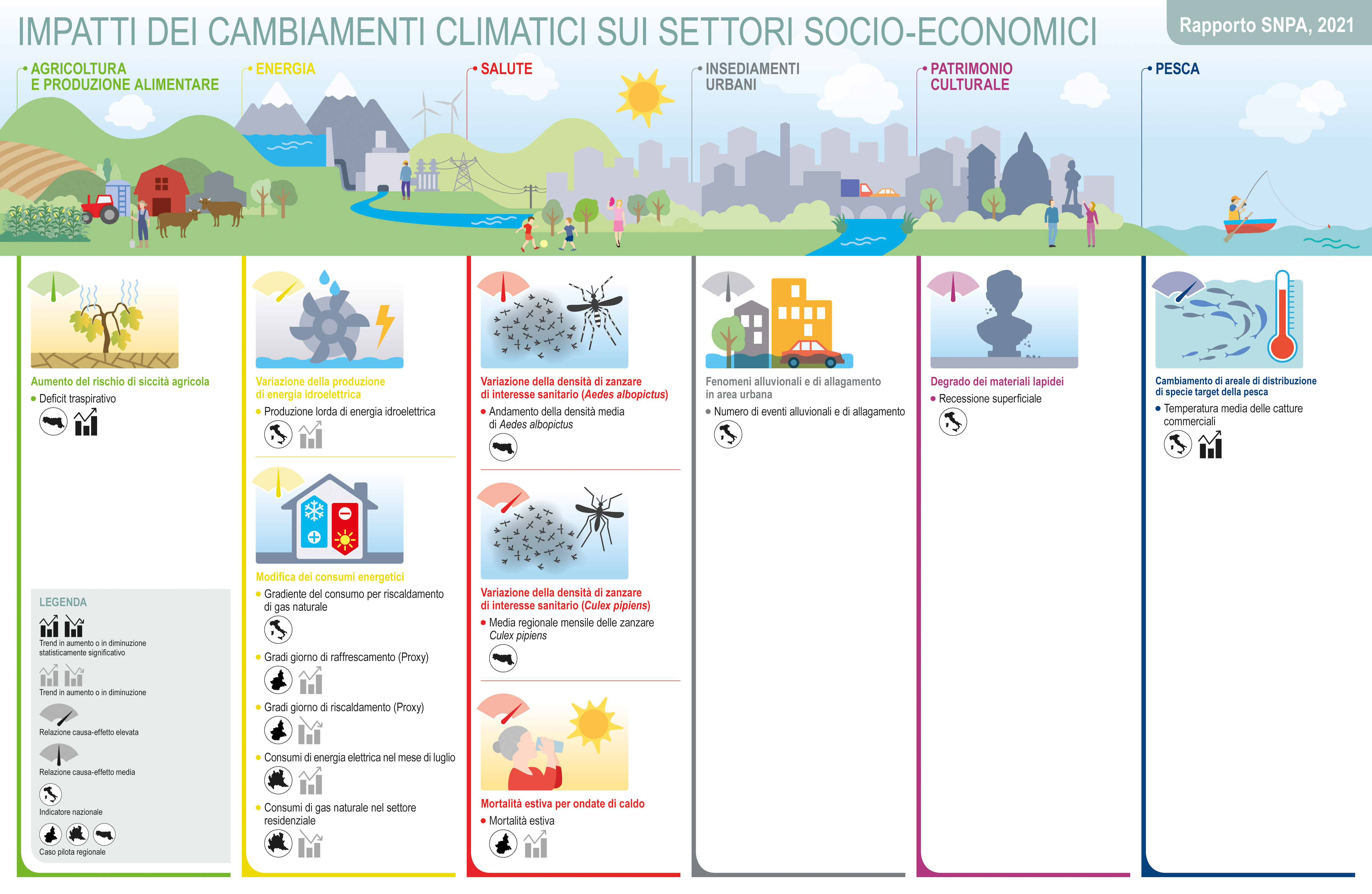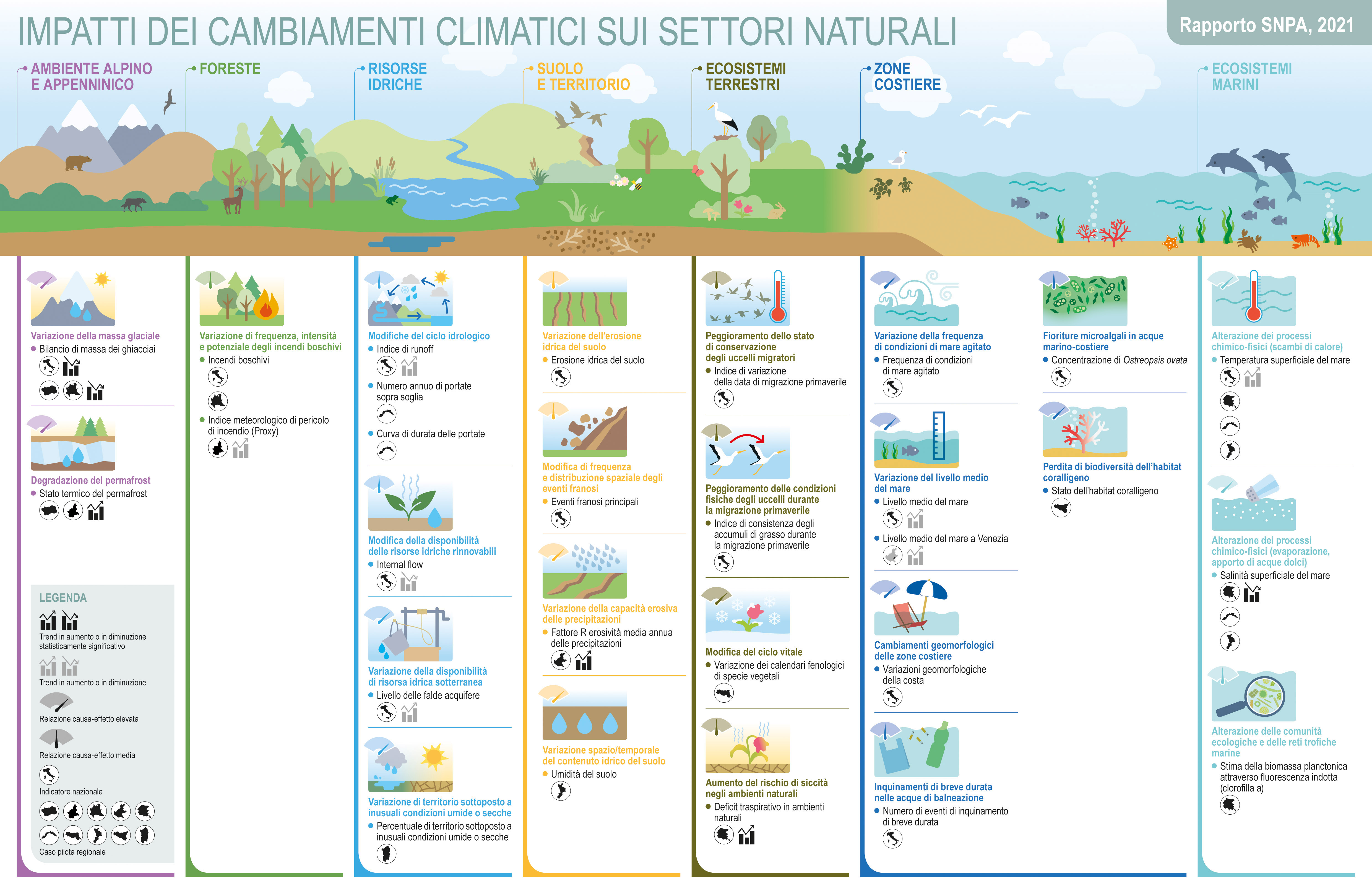 Sotto due infografiche riassuntive degli indicatori di impatto contenuti nel Rapporto relativi ai settori naturali e ai settori socioeconomici, disponibili anche in pdf ai seguenti link: Settori naturali, Settori socioeconomici.