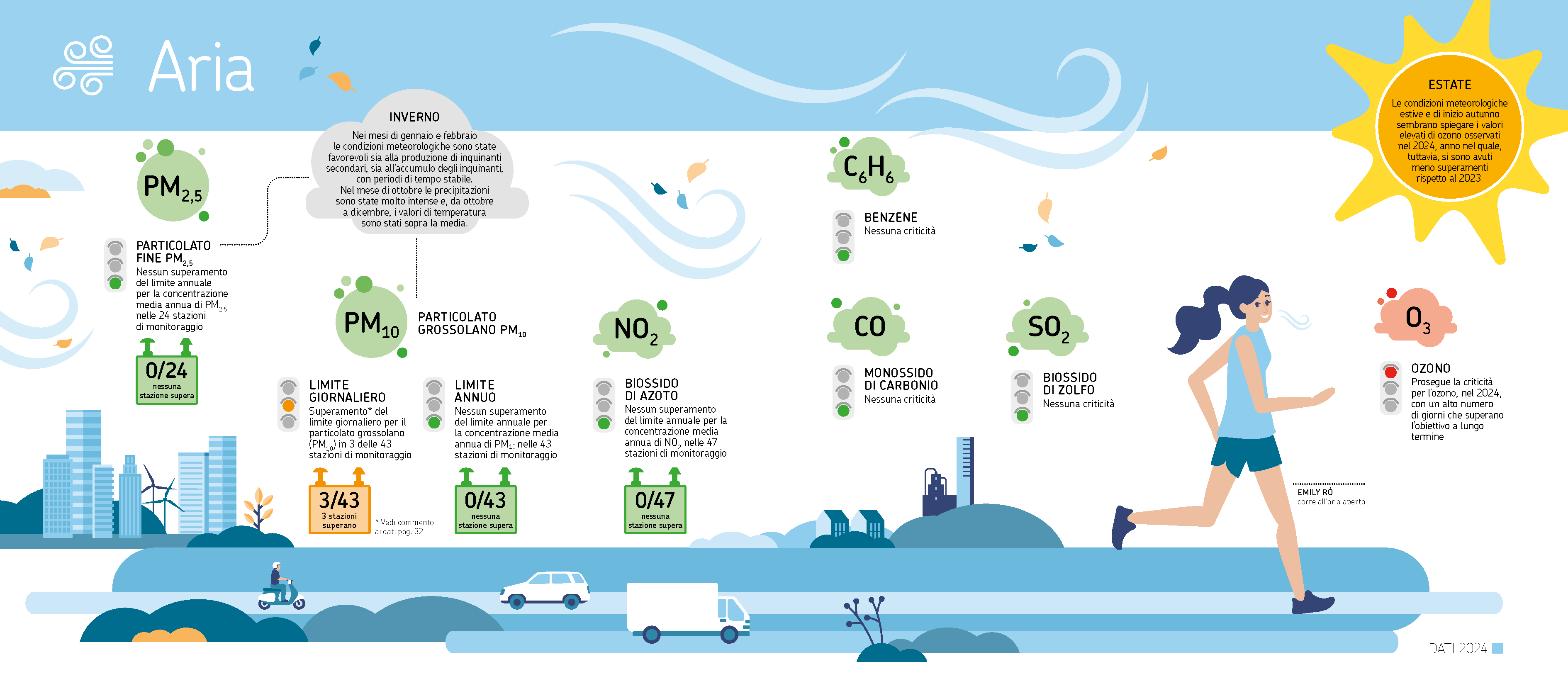 Qui viene descritta, sinteticamente, la qualità dell’aria in Emilia-Romagna per l’anno 2024, valutata attraverso indicatori specifici, popolati con i dati derivanti dalla rete regionale di monitoraggio della qualità dell’aria (visualizza la legenda).